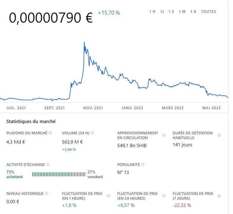 Néanmoins, certaines prédictions vont dans le sens contraire et prévoient une disparition, sur le long terme du jeton. Pour l’instant, le cours du Shiba Inu reste intrinsèquement lié à Bitcoin. C’est donc l’évolution de la première cryptomonnaie qui nous confirmera ou non une éventuelle reprise.