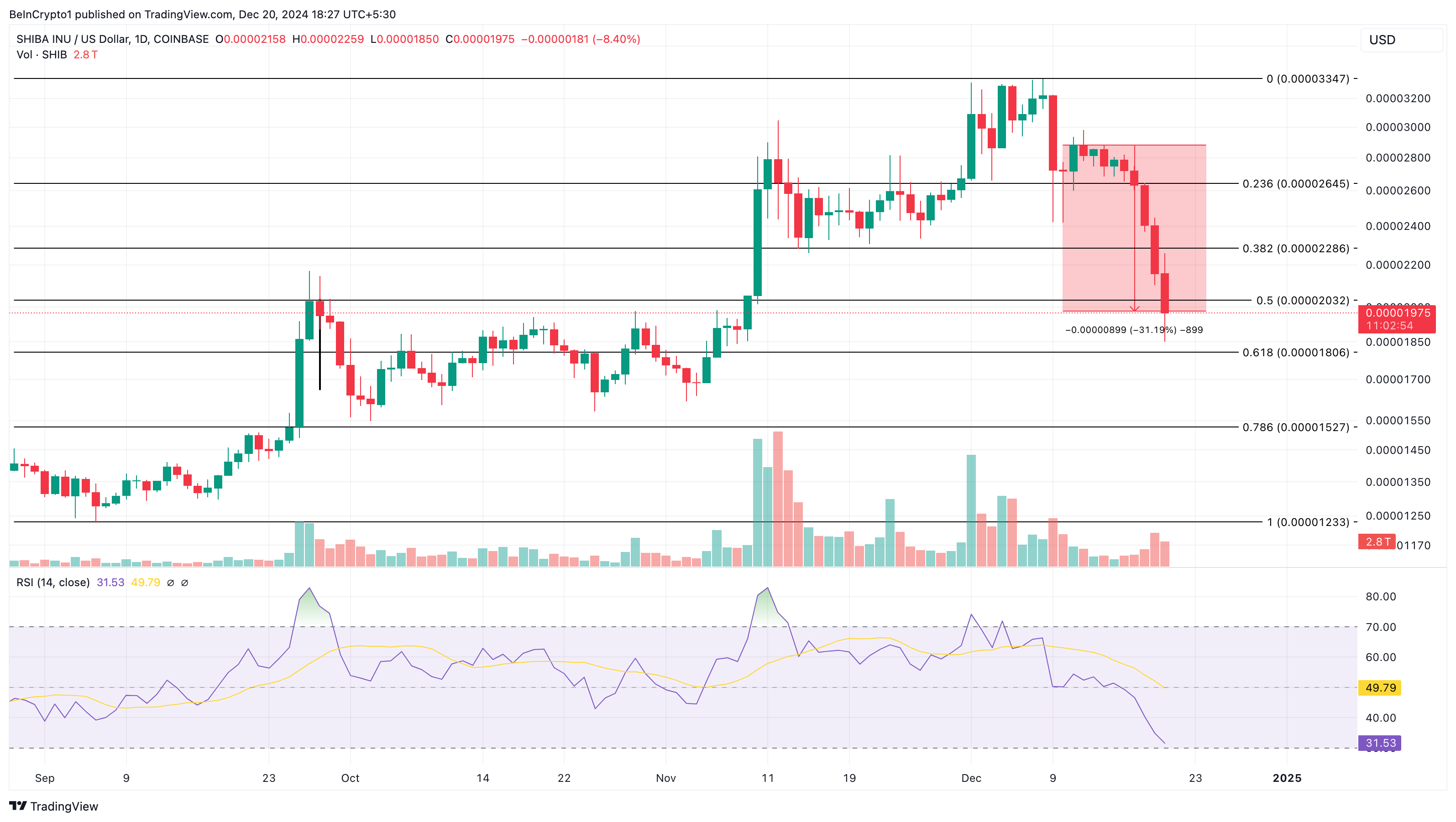 La dernière fois que le cours du SHIB a tenté de monter remonte au 11 décembre. À ce moment-là, la valeur du token était de 0,000029 $. Sur le graphique de 4 heures, la lecture de l’indice de force relative (RSI) est de 31,53.