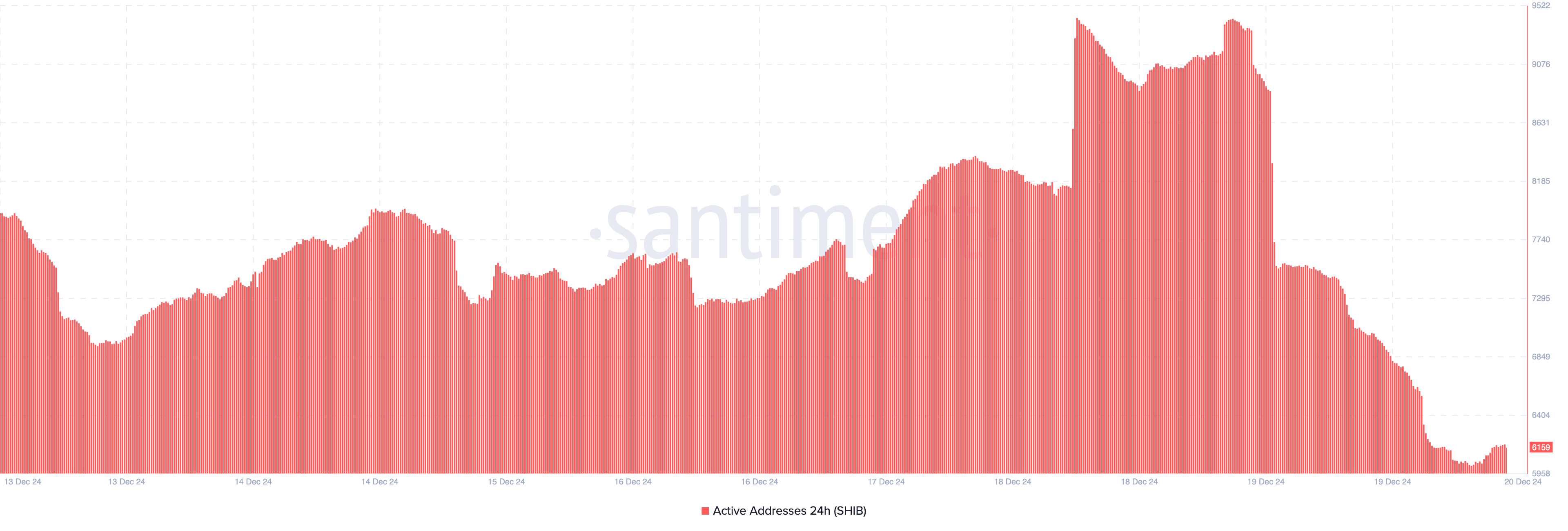 Au-delà de cela, l’activité du réseau sert d’autre indicateur clé pointant vers une baisse potentielle supplémentaire du cours de Shiba Inu. Les données on-chain de Santiment révèlent une baisse significative des adresses actives associées au token.