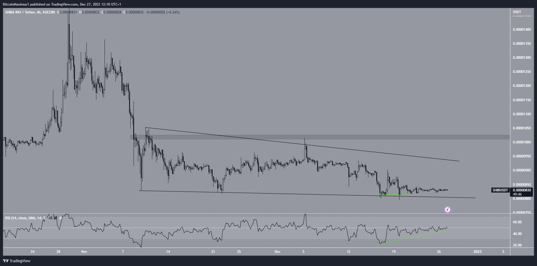 L’analyse technique des données sur quatre heures offre une vision plus haussière pour le SHIB. Le mouvement du cours depuis le 8 novembre est contenu dans un biseau descendant, ce qui est considéré comme un modèle haussier. Bien que le cours se soit consolidé au cours des dernières 24 heures, il pourrait qu’il sorte bientôt de ce schéma, ce principalement en raison de la divergence haussière développée par le RSI (ligne verte).
