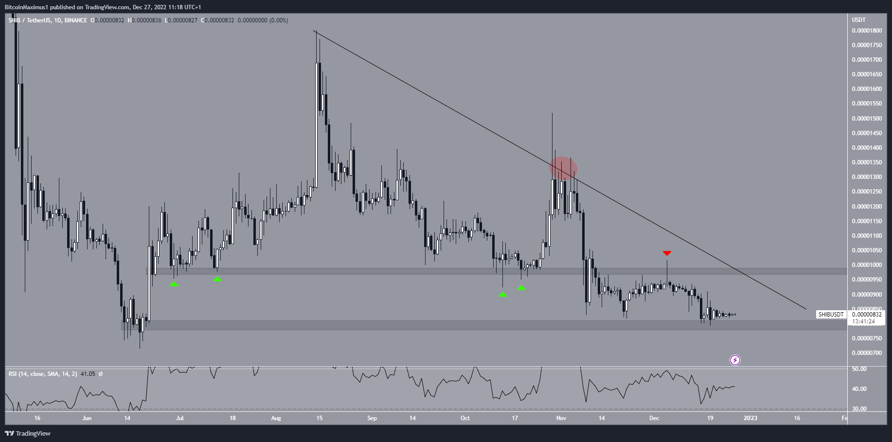 Le SHIB évolue à la baisse sous une ligne de résistance descendante depuis le 14 août. Cette ligne a provoqué plusieurs rejets du cours entre fin octobre et début novembre, avant de chuter brutalement (cercle rouge). En conséquence de ce déclin, le cours a chuté sous la zone de support de 0,0000098 $, avant de la valider comme résistance le 5 décembre (flèche rouge).