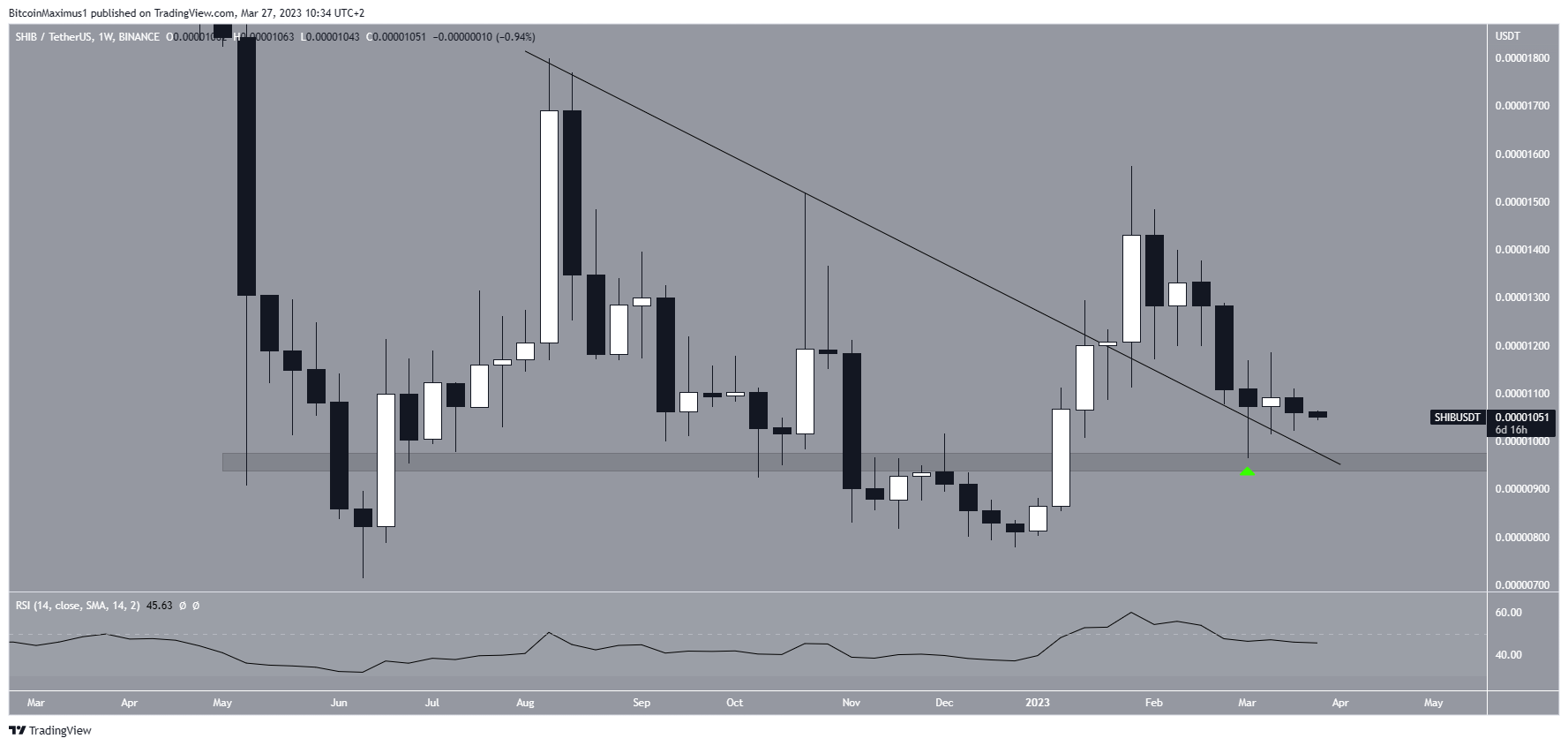 Sur l’échelle de temps hebdomadaire, le support le plus important se situe à 0,0000096 $. Cette zone a servi de support et de résistance par intermittence depuis mai 2022. Actuellement, elle coïncide avec la ligne de résistance descendante.