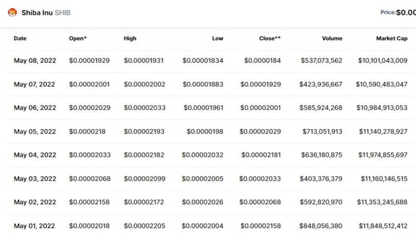 Le 10 mai, le cours du SHIB a ouvert la journée à 0,00001439 $ et a atteint un creux intraday de 0,00001375 $. Le volume des échanges s’élevait à 1,92 milliard de dollars et correspondait à une capitalisation boursière d’environ 8,91 milliards de dollars.