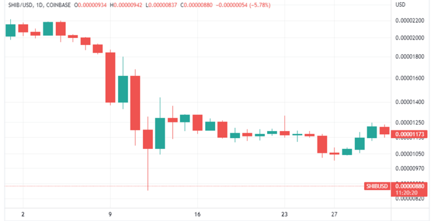 Il s’agit là d’une baisse de 24 % de la valeur boursière de Shiba Inu par rapport au jour d’ouverture. En raison de la chute du cours, qui lui a fait atteindre de nouveaux creux, le token n’a pas pu se rétablir pour le reste du mois.