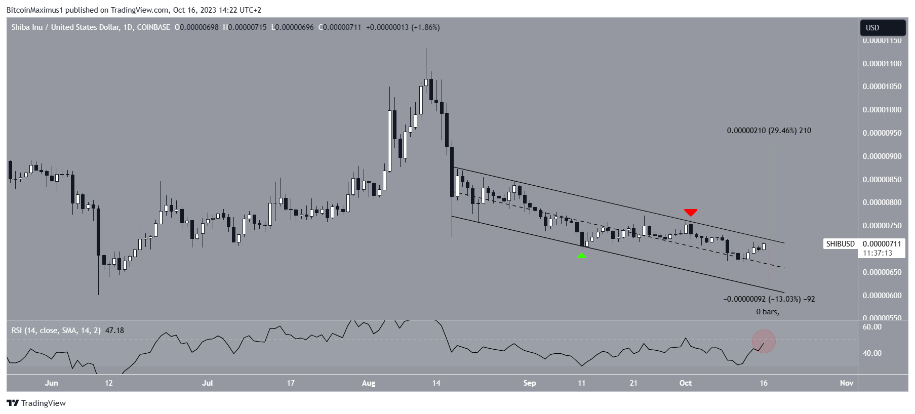 En cas de percée, le SHIB pourrait alors augmenter de 30 % pour atteindre 0,0000095 $. Au contraire, un rejet peut conduire à une chute de 13% jusqu’à la ligne de support du canal à 0,0000063 $.