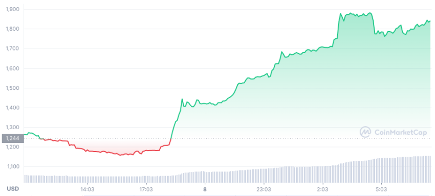 L’impact de cette nouvelle sur le cours du LEASH ne s’est pas fait attendre. Selon les données de CoinMarketCap, le token s’échange actuellement à 1 825,82 dollars, ce qui correspond à une hausse de 46% au cours des dernières 24 heures.