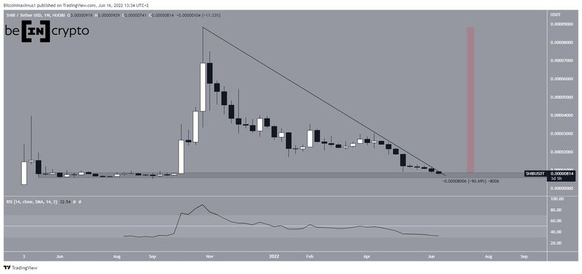 La crypto SHIB est en déclin depuis son cours record de 0,000088 $ atteint le 28 octobre 2021. Ce déclin l’a mené à un creux local de 0,0000074 $ atteint le 13 juin. Cela équivaut à un déclin de 90,50 % depuis son sommet record.