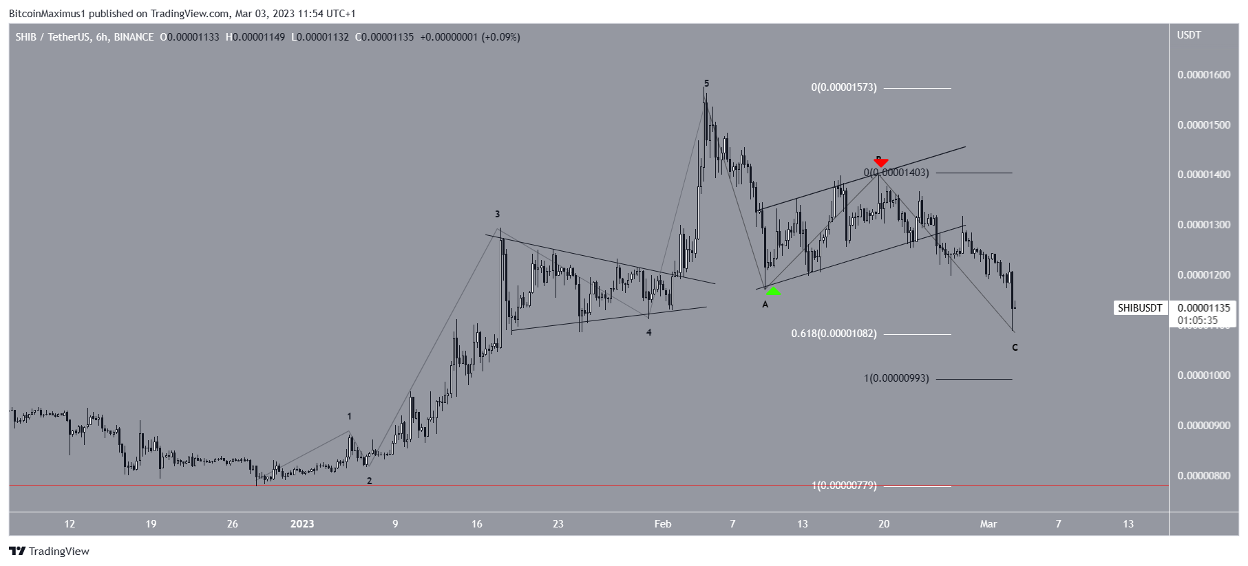 Si les vagues A:C présentent un ratio de 1:1, cela mènerait à un creux de 0,0000099 $. Sachant que cet objectif se trouve proche du support du retracement 0,618 de Fibonacci situé à 0,0000108, il serait probable que le cours atteigne un plancher entre ces deux niveaux. Le mouvement de hausse de Shiba Inu pourrait ensuite reprendre.