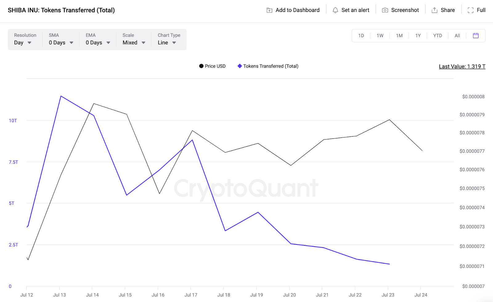 Comme on peut le voir sur le graphique Cryptoquant ci-dessous, entre le 14 et le 24 juillet, le nombre de SHIB transférés a chuté de 89 %, passant ainsi de 11,5 billions à 1,3 billion de SHIB.