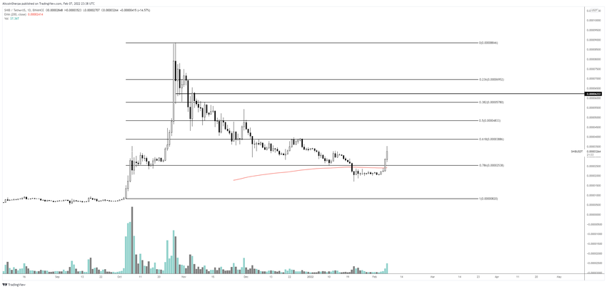 Le cours du token SHIB évoluait à la baisse depuis son prix record de 0,000088 $ le 28 octobre 2021. Ce mouvement de baisse a conduit à un plancher de 0,000017 $ atteint le 22 janvier. Cela correspond à une baisse de 80% par rapport à son sommet record.