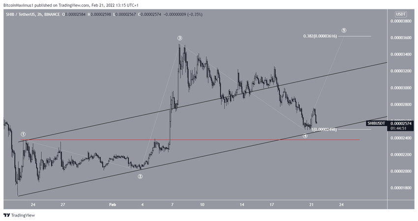 Il est possible que la baisse actuelle de Shiba Inu fasse partie de la quatrième vague d’un mouvement ascendant en cinq vagues (blanc). Dans ce cas, le SHIB est en train de compléter un repli de quatrième vague. Il s’agit d’une situation au sein de laquelle une forte baisse est suivie de sa cinquième et dernière vague.