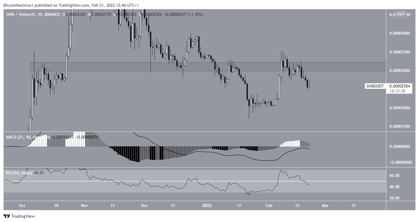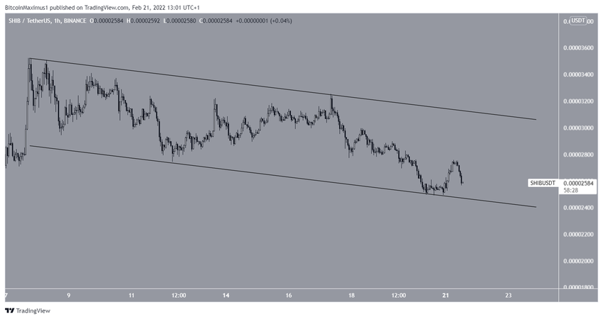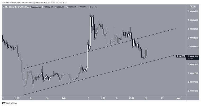 Le graphique sur six heures montre que le cours de Shiba Inu a dépassé un canal parallèle ascendant le 7 février. Le cours n’ayant pas pu maintenir son mouvement de hausse, il est retombé à l’intérieur de ce canal le 17 février et évolue actuellement près de sa ligne de support.