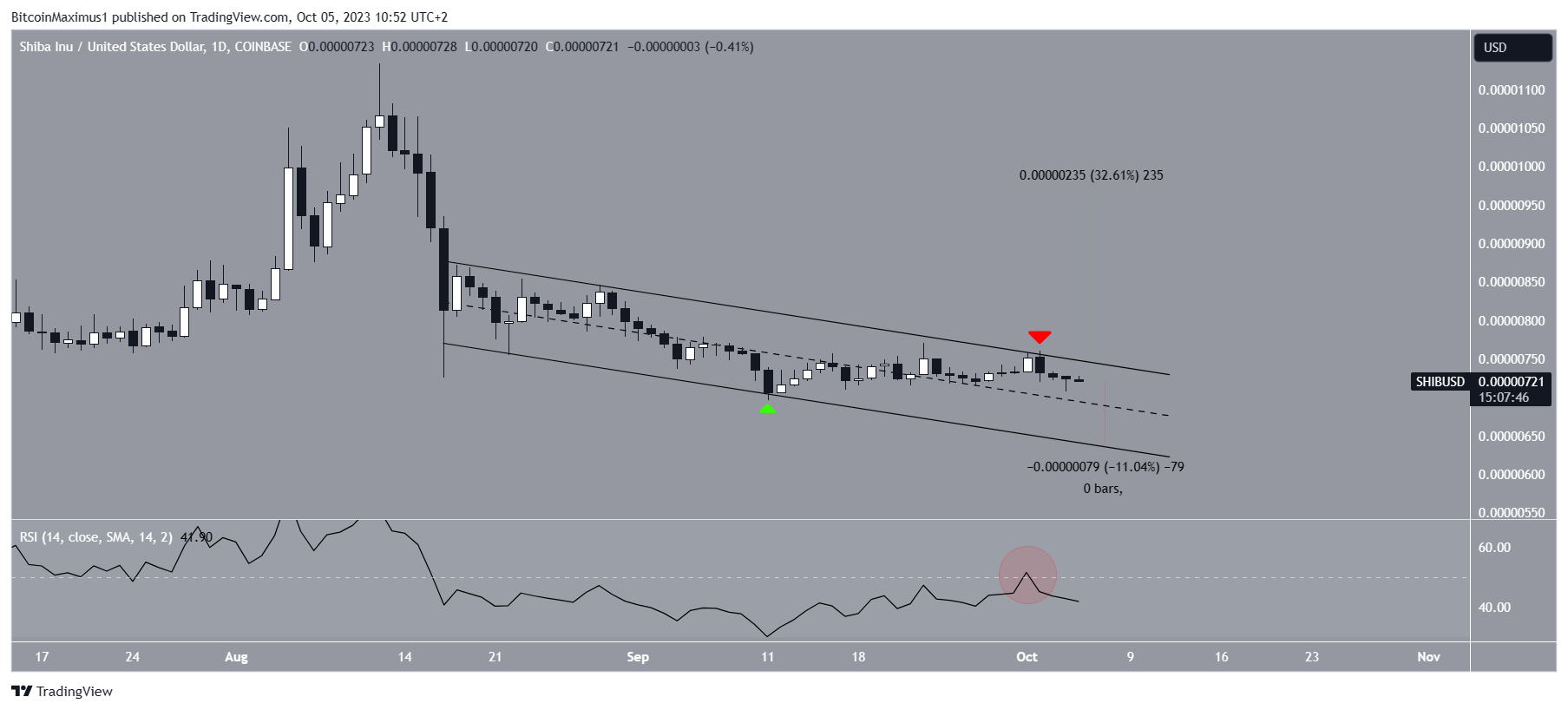 Cependant, SHIB est en baisse depuis qu’il a été rejeté par la ligne de résistance du canal ce lundi 2 octobre. De plus, le RSI hebdomadaire, qui poursuit sa dégringolade, n’a pas réussi à dépasser la ligne 50 (cercle rouge).