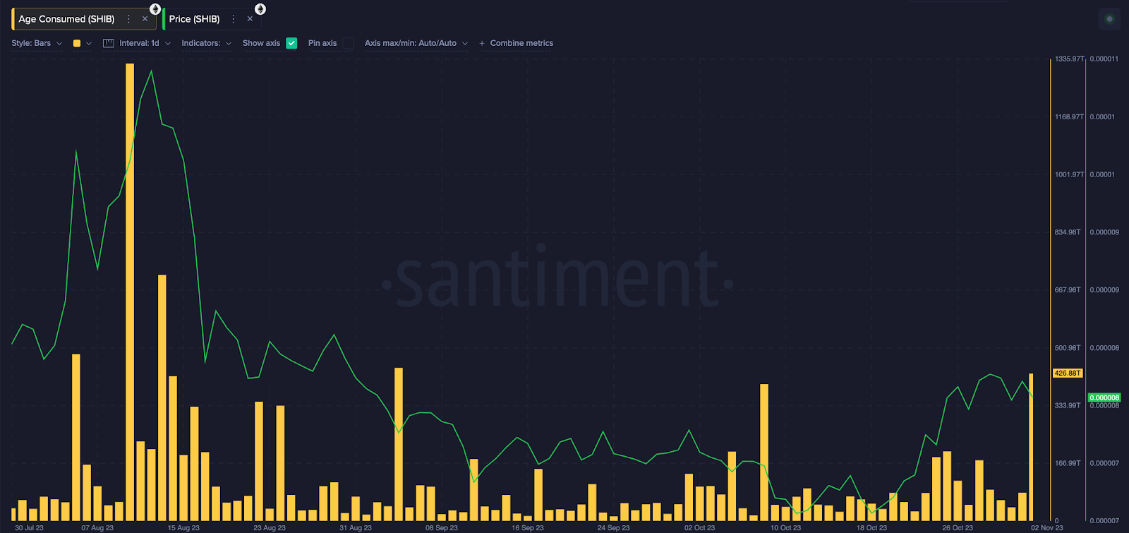Comme on peut le voir dans le graphique ci-dessous, l’indicateur Age Consumed (âge consommé) de Shiba Inu a dépassé les 436,88 billions ce jeudi 2 novembre. Les deux dernières fois que l’indicateur a atteint un pic aussi élevé remontent aux 8 octobre et 4 septembre, respectivement. Les deux pics ont été suivis d’une correction importante du cours SHIB.