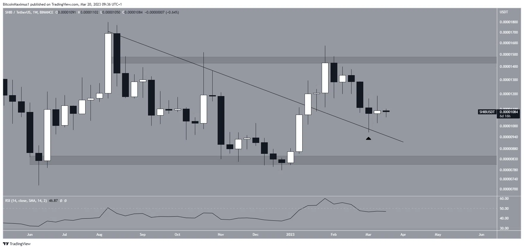Fin janvier, 🐕 le cours Shiba Inu a dépassé une ligne de résistance descendante. Il est ensuite monté à un nouveau sommet annuel de 0,0000154 $ avant de rechuter. Le 7 mai, ce déclin a permis de valider la ligne en tant que support (flèche noire). Bien que le cours SHIB se soit depuis rétabli, le RSI quotidien reste inférieur à 50. On ne peut donc pas déterminer si la tendance est haussière.