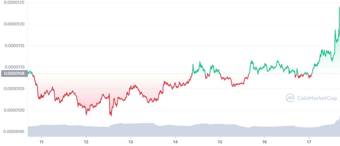 Sur la journée du lundi 18 juillet, le token est en hausse de près de 14 % avec un prix de 0.00001225 $ par jeton.