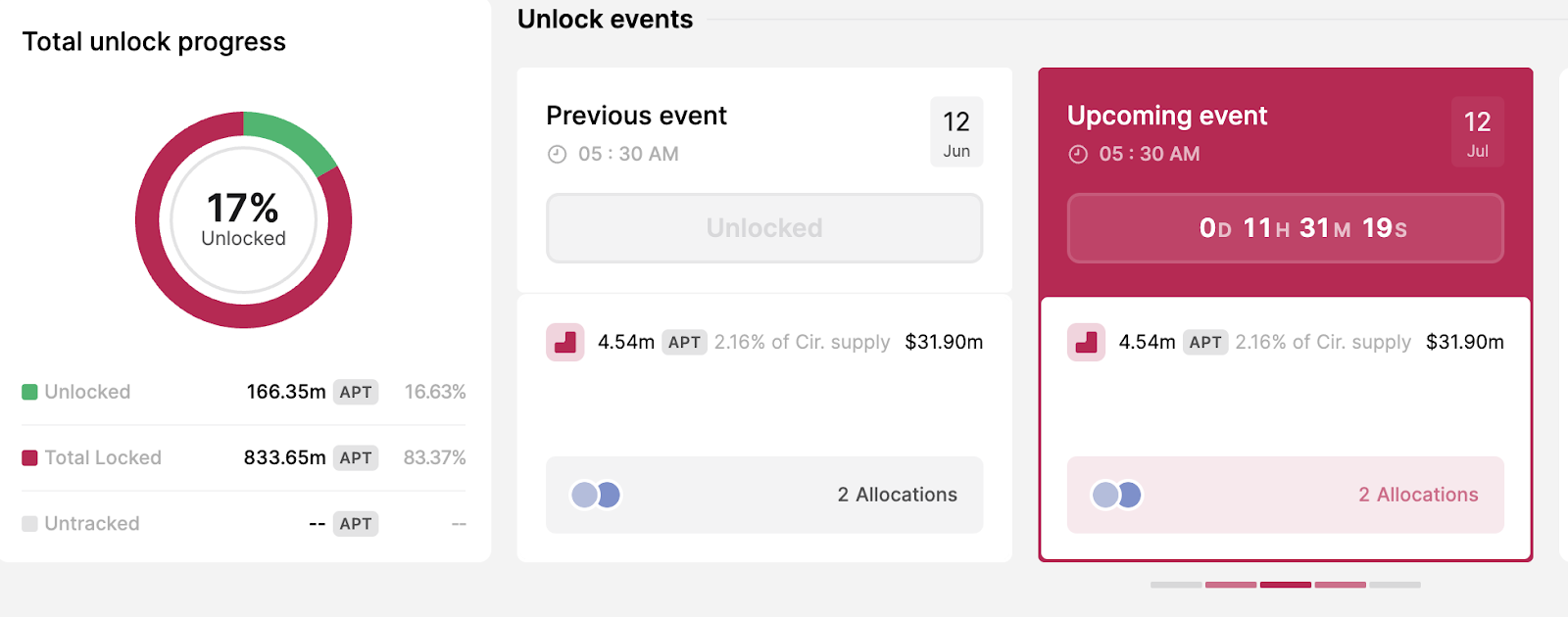 Selon les données de Token Unlocks, plus de 138 millions de dollars de tokens seront débloqués ce mois-ci. Cela dit, le vesting le plus proche est celui d’Aptos (APT), qui devrait avoir lieu ce mercredi 12 juillet.