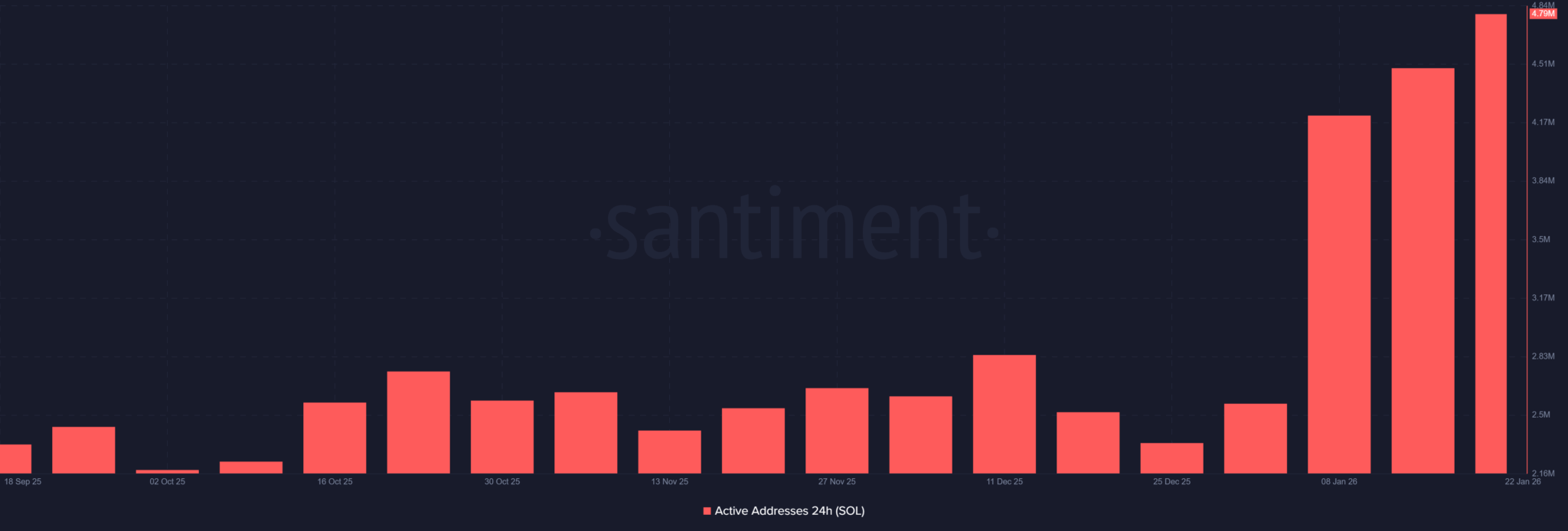 L’activité sur Solana s’est intensifiée depuis le début de 2026, le nombre d’adresses actives passant de 2,5 à 4,8 millions. Cette progression reflète un retour massif des utilisateurs et une utilisation accrue de la blockchain, au-delà de la simple spéculation sur les prix.
