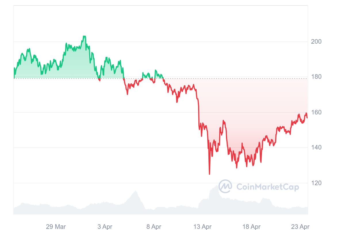 Après avoir dépassé les 150 $, le SOL de Solana est maintenant en train de s’attaquer au 160 $. En effet, la pièce de Solana s’échange actuellement à 159 $, avec une très belle hausse sur les 7 derniers jours. Sur cette période, le jeton a ainsi réussi à gagner 18,68 %. Progressivement, le projet arrive à se remettre de sa dernière baisse en date, qui l’a mené sous les 125 $. Malgré tout, l’actif reste en retrait de 40 % par rapport à son ancien ATH annuel datant de mars 2024 (210 $).
