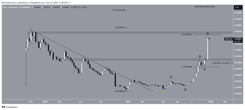 Finalement, c’est Ethereum qui a surperformé le SOL tout au long de la première moitié de l’année, et la tendance s’est inversée au cours de la seconde. Le cours s’approche maintanant de son sommet historique de 0,055 ETH. Cependant, le rallye est devenu complètement parabolique.