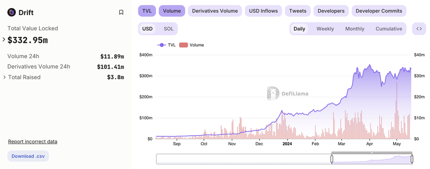 Il est également à noter que Drift a contribué à plus de 20 milliards de dollars en volume de trading cumulé et détient actuellement plus de 333 millions de dollars en valeur totale bloquée (TVL), selon les données de DeFiLlama.