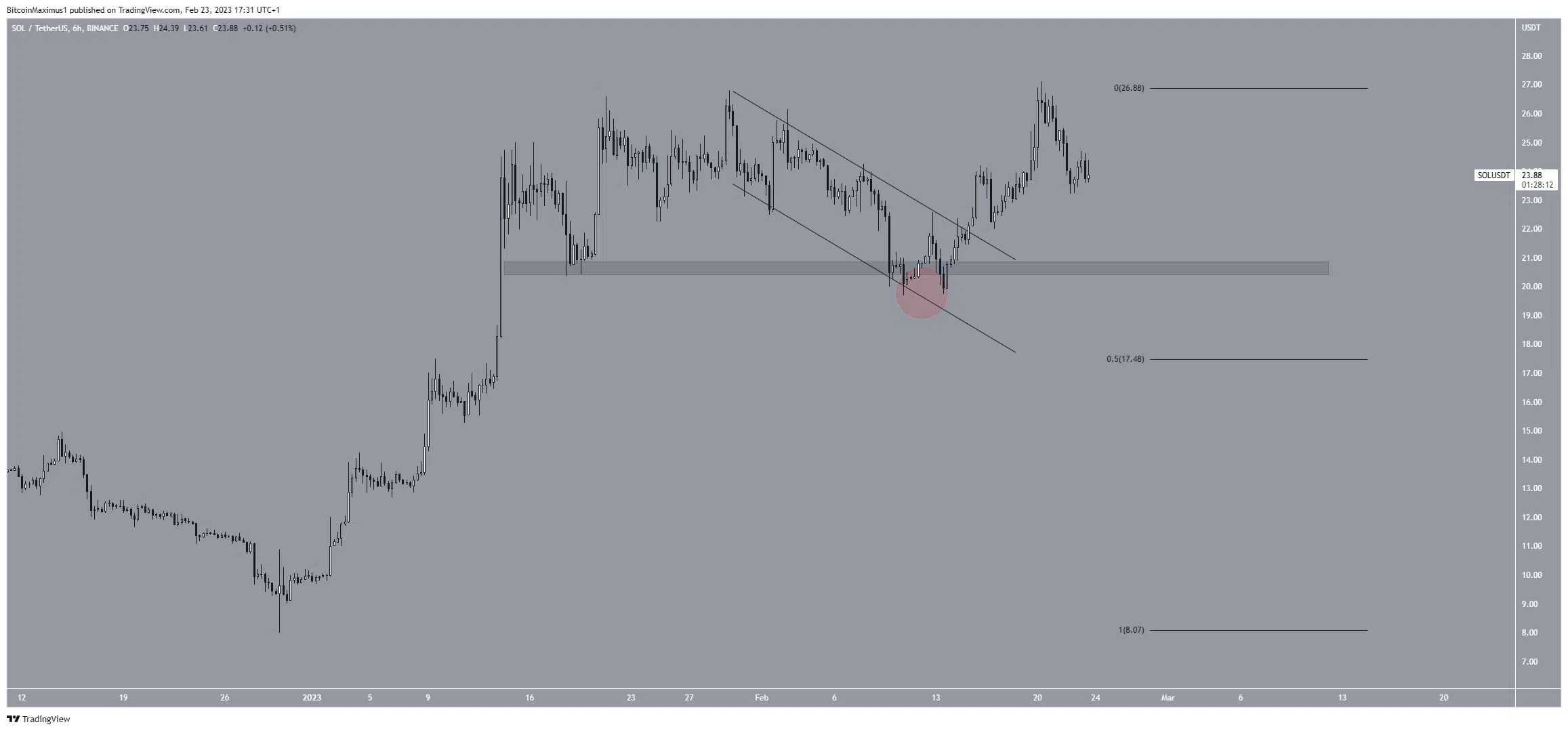 Le mouvement du cours au sein du graphique sur six heures nous confirme le sentiment haussier présent dans les données quotidiennes. Après une déviation (cercle rouge) sous le support horizontal de 20,60 $, le cours de Solana a dépassé un canal parallèle descendant. Ce genre de déviation précède souvent les mouvement de hausse, comme cela a été le cas pour le SOL.