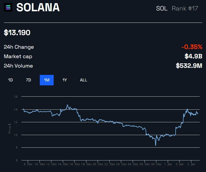 SOL a bondi de 40 % au cours de la semaine dernière. La crypto-monnaie a atteint un sommet sur trois semaine de 14 $, le 4 janvier, mais n’a pas pu briser la résistance à ce niveau.