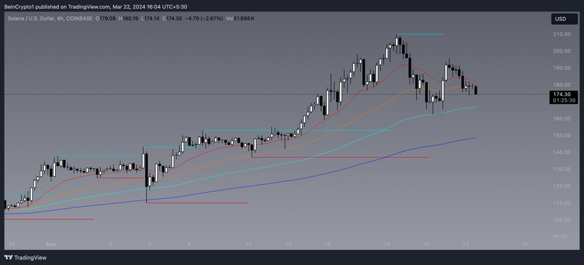 Comme nous pouvons le voir sur le graphique des prix SOL, les EMA à court terme sont nettement supérieures aux EMA à plus long terme, telles que les EMA 100 et 200, mais s’alignent sur le niveau du cours actuel. Dans ce cas, cela suggère une consolidation du cours de SOL à court terme.