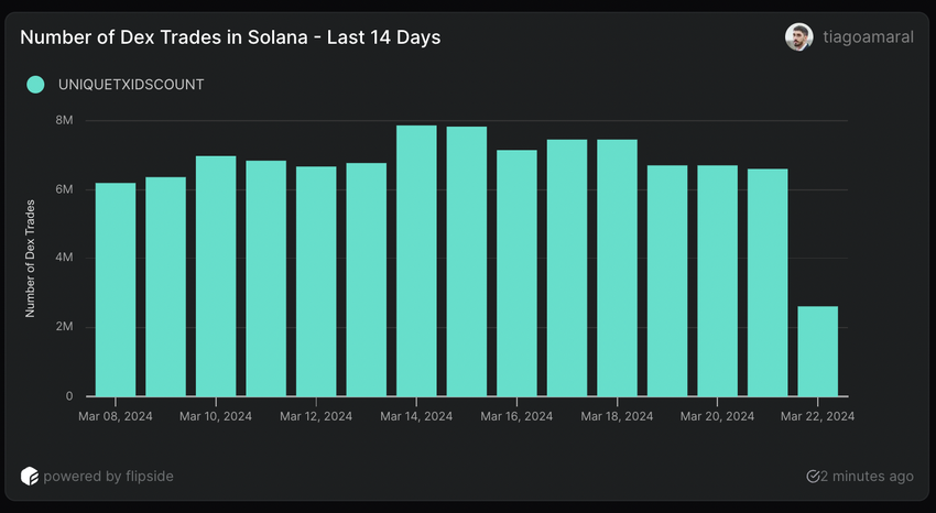 L’analyse de deux données on-chain de Solana révèle plusieurs scénarios intéressants. Le volume quotidien record de transactions des DEX (exchanges décentralisés), qui a atteint 7,86 millions le 14 mars, est un record absolu. Depuis le 8 mars, le volume des transactions sur les DEX de Solana a toujours été supérieur à 6 millions de transactions par jour. Il s’agit d’une croissance considérable par rapport à la période antérieure à décembre 2023, lorsque le volume quotidien de transactions sur les DEX de Solana plafonnait à 2,2 millions.