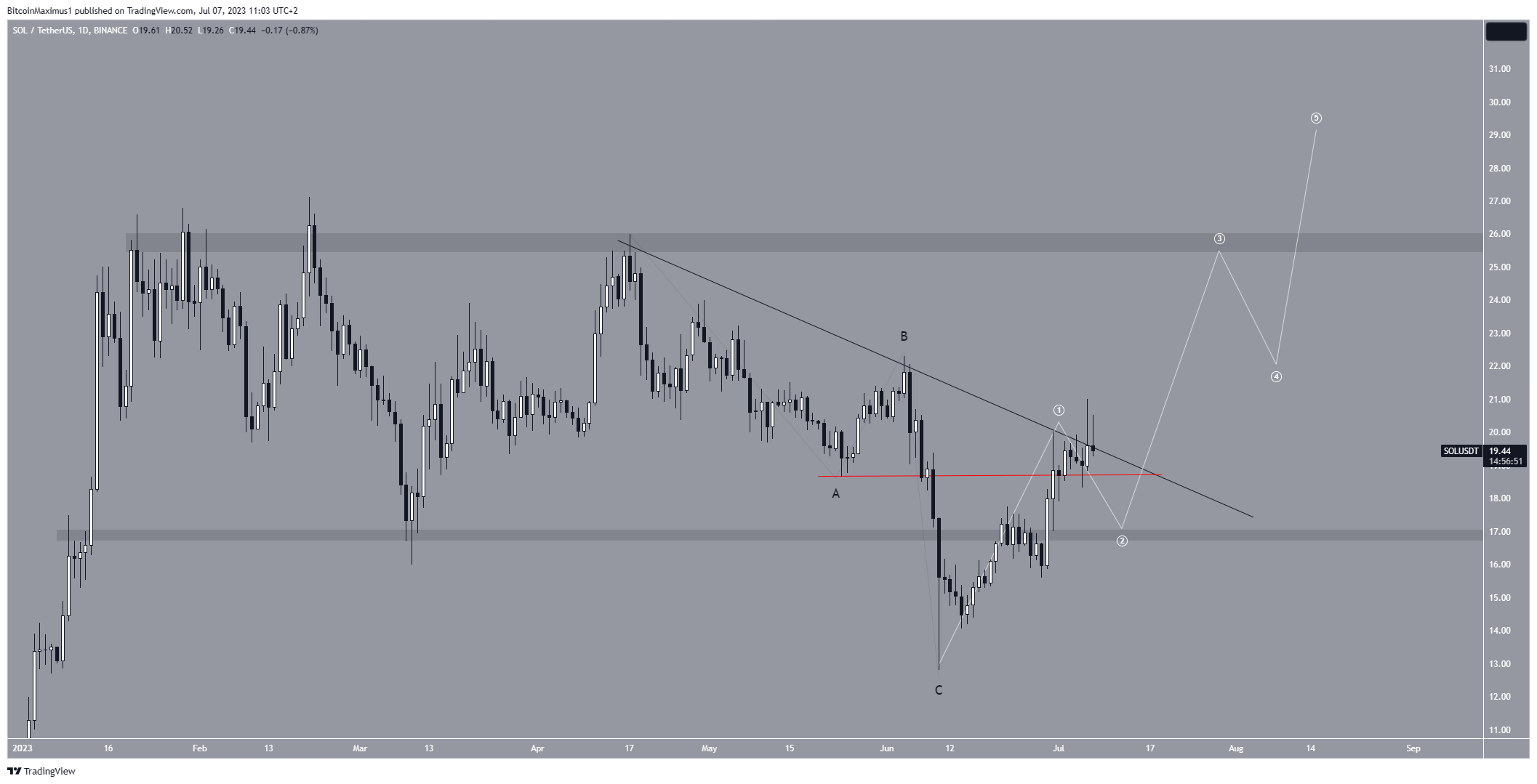 Si le décompte de vagues s’avère correct, le cours Solana a probablement entamé un mouvement haussier en cinq vagues le 10 juin (représenté par la ligne blanche) et est susceptible de franchir sa ligne de résistance. Dans ce cas, il pourrait atteindre sa prochaine résistance de 26 $.