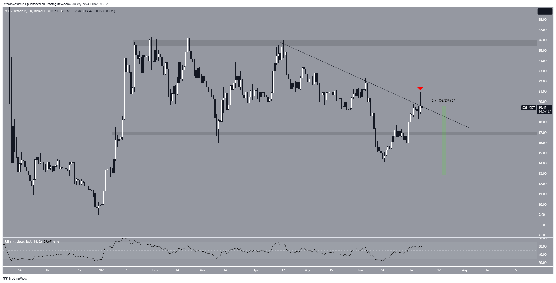 Actuellement, le cours SOL tente de sortir d’une ligne de résistance descendante, qui est en place depuis le 17 avril (icône rouge). Un passage au-dessus de cette ligne aurait pu accélérer le rallye et confirmer la tendance haussière.