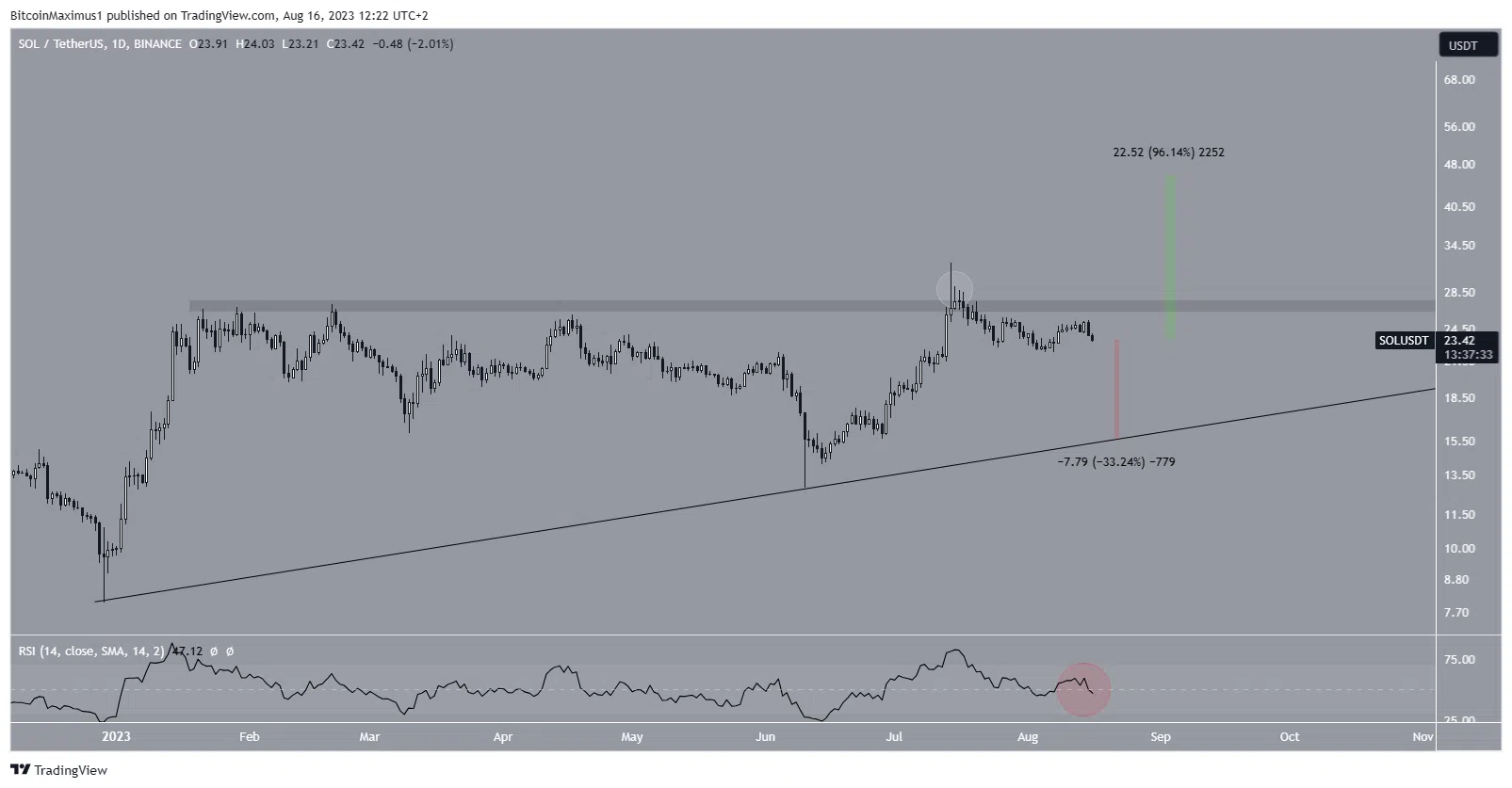 SponsoredSi la baisse se poursuit, le cours SOL risque de retomber vers sa ligne de support ascendante de 15,40 $. Cela équivaudrait à une baisse de 33 %.