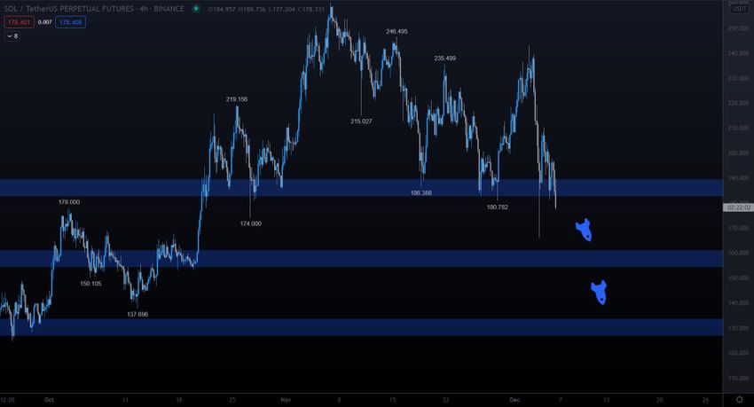 Le token SOL est en baisse depuis qu’il a atteint un prix record de 259,9 dollars le 6 novembre. Cette baisse s’est poursuivie jusqu’à un creux de 169 $, atteint le 4 décembre.