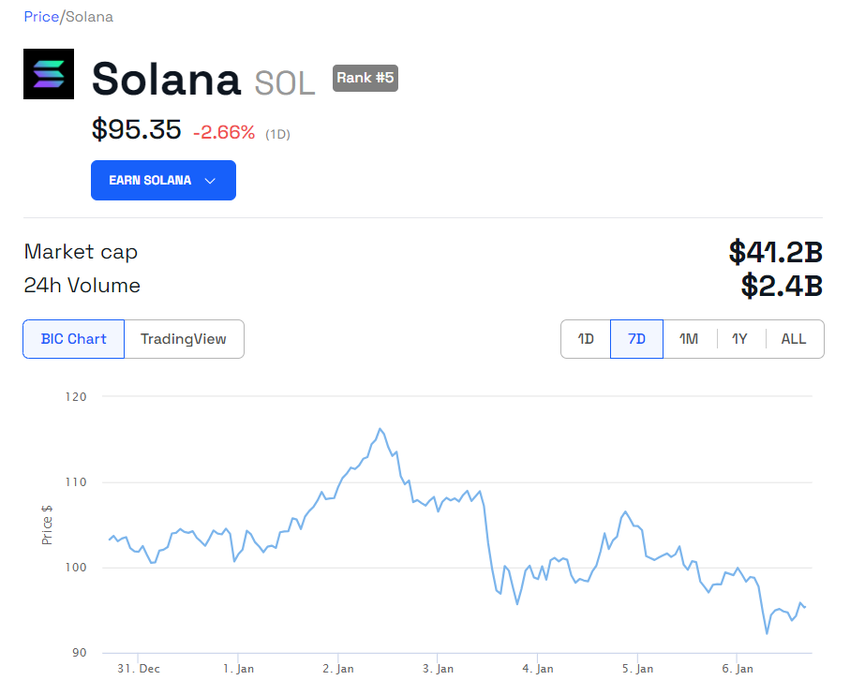 Le cours de la crypto SOL de Solana a connu un recul notable au cours de la première semaine de la nouvelle année, chutant de 10 % pour s’établir à moins de 100 dollars. Cette baisse a marqué un recul significatif par rapport à son récent pic de 115 dollars atteint le 2 janvier.