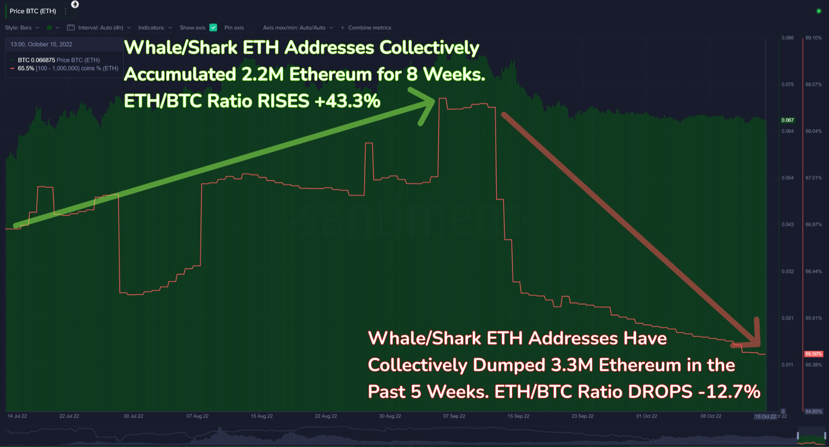 Cependant, depuis la fusion Ethereum, ces mêmes adresses se sont débarrassées de leurs avoirs de façon spectaculaire. 3,3 millions d’Ethereum ont ainsi quitté ces adresses, et l’ETH/BTC perd ses gains au même rythme.