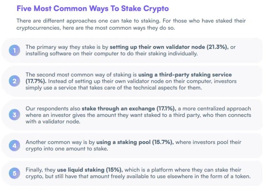 Pour éviter le verrouillage des fonds, 15% des investisseurs interrogés se disent prêts à essayer le staking liquide. Avec celui-ci, les gens peuvent placer leur crypto en staking, mais utiliser librement les montants investis sous forme de jetons.