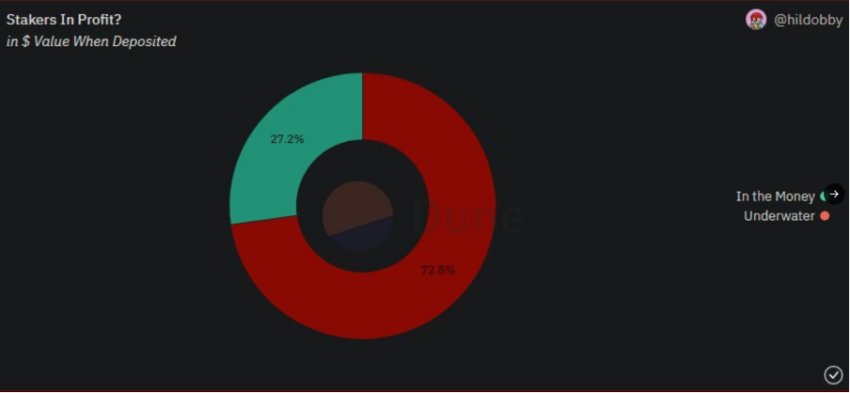 À en croire Delphi Digital, plus de 70 % des stakers seraient en situation de perte. En effet, la plupart des validateurs ont verrouillé leurs ETH lorsque l’actif s’échangeait entre 1 600 $ et 3 500 $. De même, environ 830 000 pièces ont rejoint la Beacon Chain lorsque le cours ETH dépassait les 4 000 $.