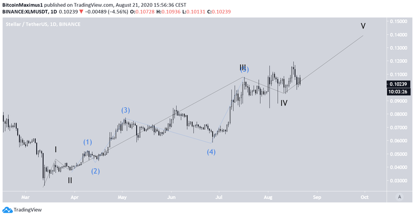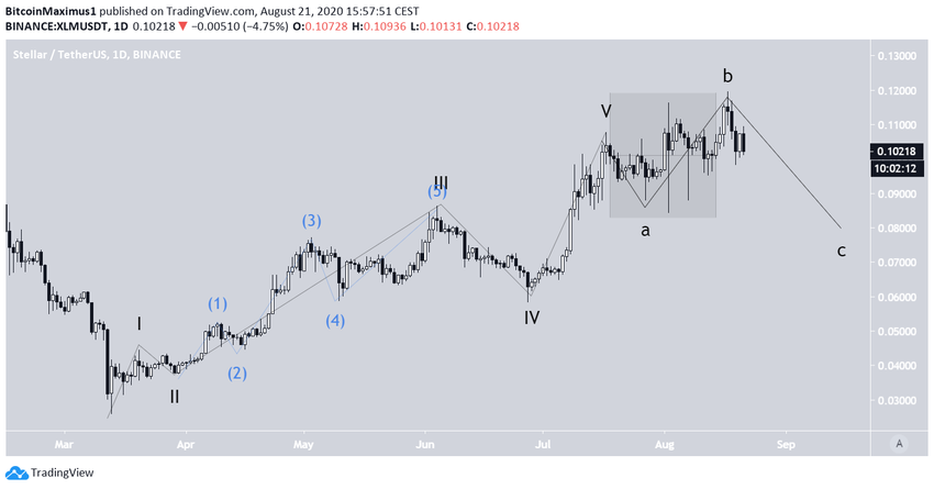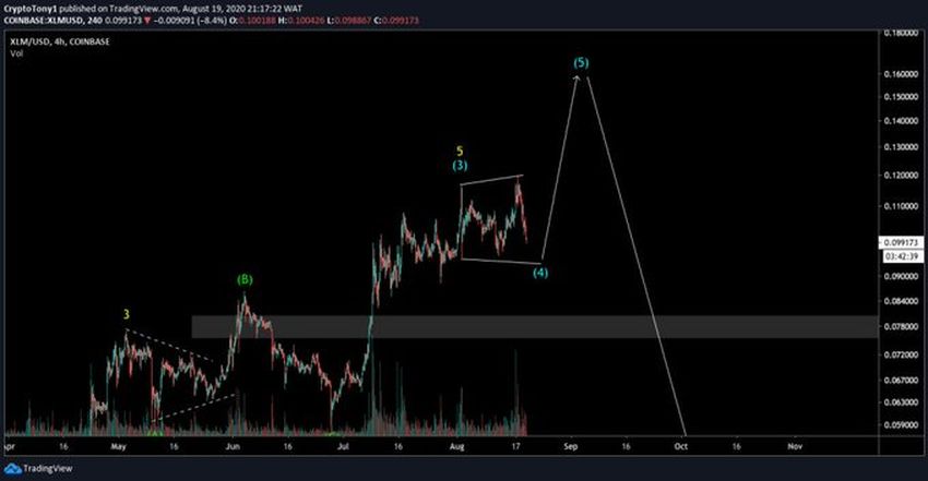 Le trader de cryptomonnaies @Glowto1994 a souligné un décompte de vagues pour le XLM, dans lequel le cours augmenterait jusqu’à 0,16$ après une chute à court terme.