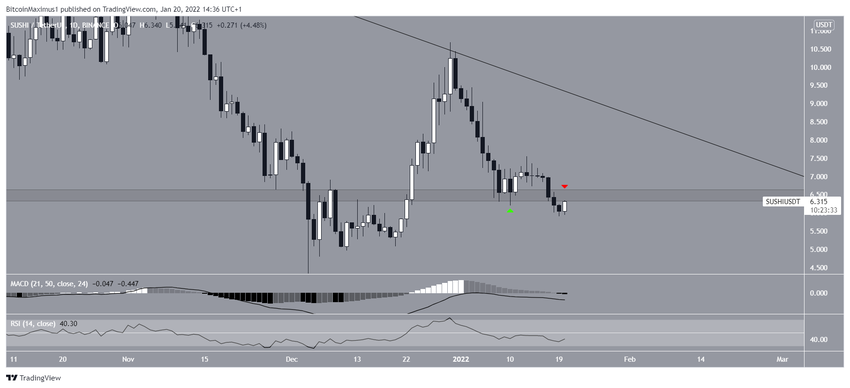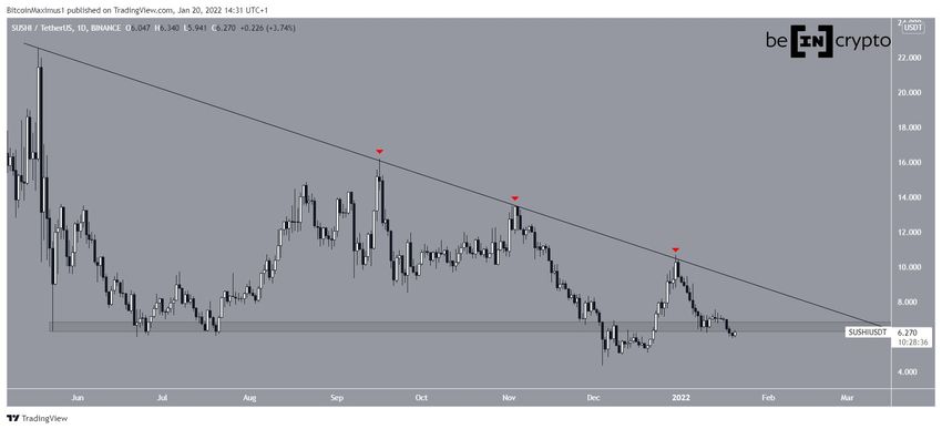 Le cours du token SUSHI a diminué le long d’une ligne de résistance descendante depuis qu’il a atteint un prix record de 22,53 $ le 18 mai 2021. Cette ligne a rejeté le cours à quatre reprises, la plus récente remontant au 30 décembre 2021.