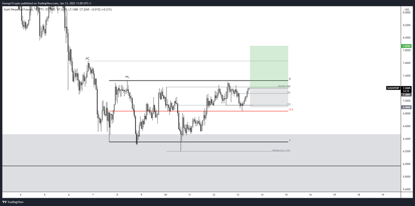 Le crypto-trader @George1Trader a tweeté un graphique de SushiSwap, affirmant que le token pourrait monter vers 8 dollars.