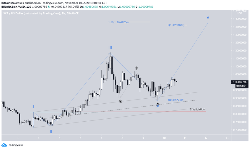 Le SXP pourrait avoir complété une impulsion haussière, confirmée avec un passage au-dessus d’une ligne de résistance descendante. Le cours pourrait alors continuer à s’accroître vers les zones de résistance mentionnées ci-dessous.