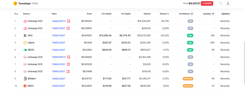 Par la suite, les exchanges crypto BKEX et Coinsbit ont également listé le jeton sur la journée d’hier. Les possibilités d’acquérir le token TAMA se sont donc multipliées, même si OKX et Uniswap sont responsables de la grande majorité du volume de transactions.