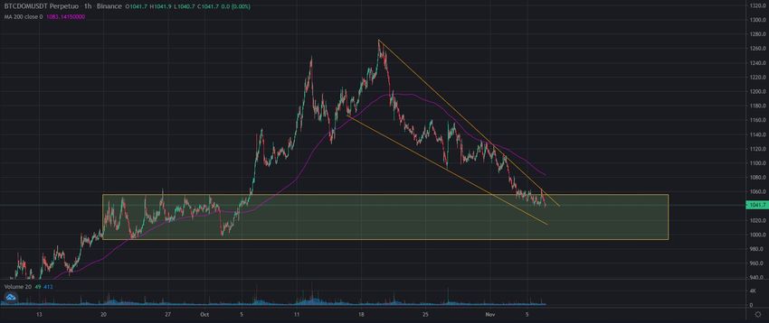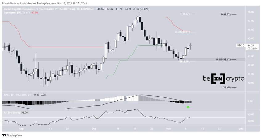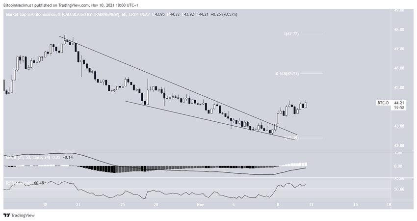 Le BTCD a évolué à la baisse depuis qu’il a atteint un sommet à 47,72% le 20 octobre. Le mouvement de baisse est arrivé à son point le plus bas, situé à 42,37%, le 6 novembre.