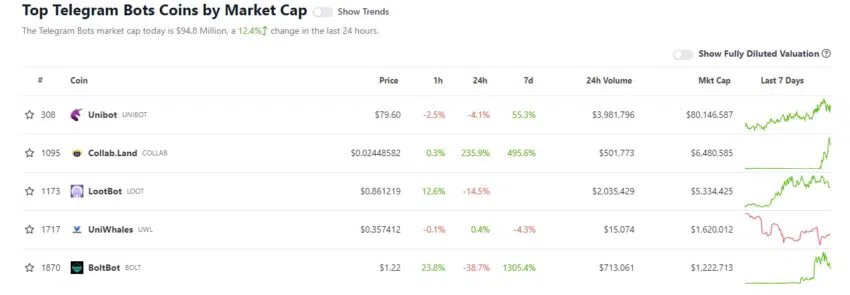 La capitalisation boursière des Telegram Bot tokens a atteint 93 millions de dollars en un rien de temps. Mieux encore, certaines plateformes crypto, comme CoinMarketCap et CoinGecko, ont créé des catégories entièrement consacrées à ces tokens.