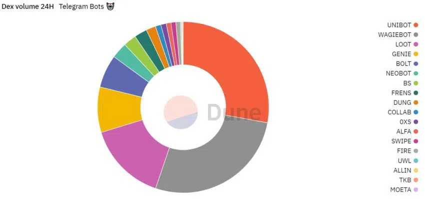 En effet, le volume quotidien des Telegram Bot Tokens est passé de 10,4 millions de dollars à 15,1 millions de dollars entre le 19 et le 20 juillet. Unibot, qui fonctionne sur l’💱 exchange décentralisé (DEX) Uniswap, se taille à lui seul une part de marché de 33 %.