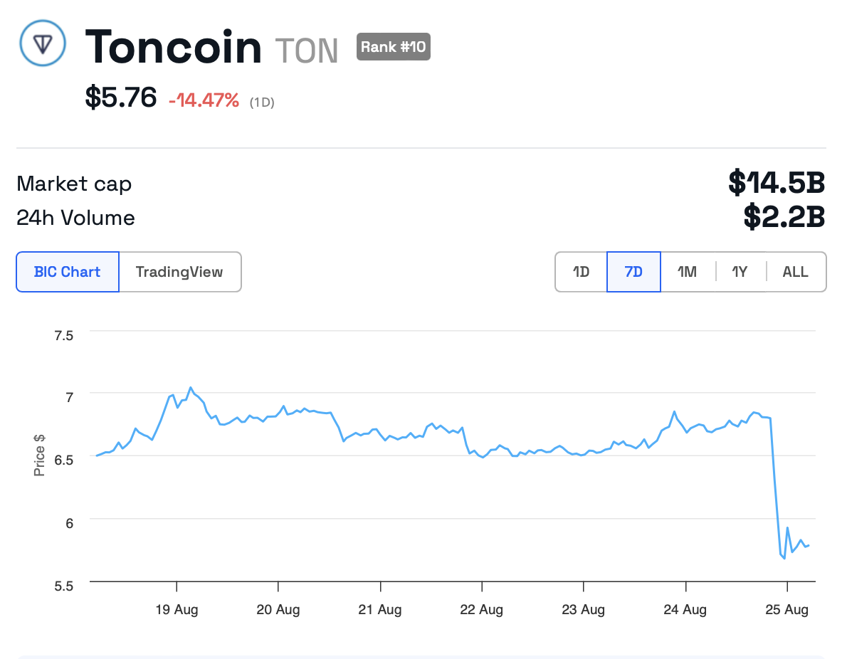 Depuis l’annonce, le cours du Toncoin a en effet chuté d’environ 15%, passant de 6,80 $ à 5,76 $, selon les données de BeInCrypto.