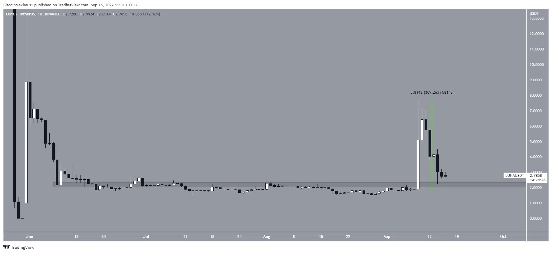 La crypto LUNA a été sujette à un mouvement de hausse massif le 9 septembre, gagnant 310 % dans la même journée pour atteindre un sommet de 7,66 $. Cependant, la cryptomonnaie n’a pas pu maintenir son mouvement et le cours a généré une très longue mèche le même jour.