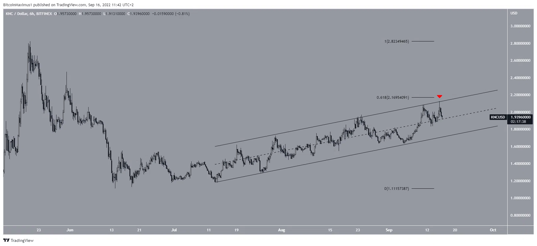 Le KNC a atteint un sommet de 2,15 $ le 15 septembre. Le sommet a validé la ligne de résistance du canal, ainsi que celle du retracement de Fibonacci 0,618.