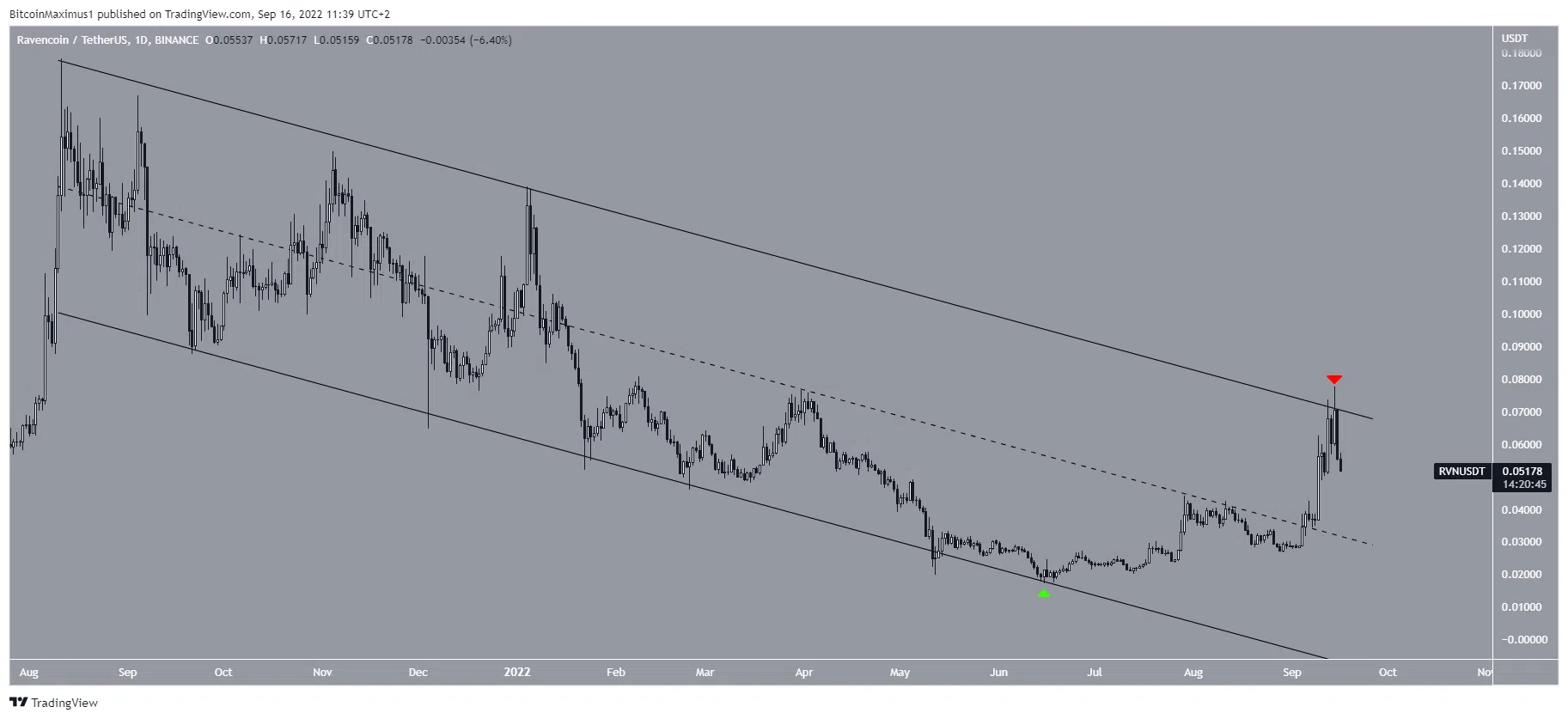 Ensuite, la cryptomonnaie Ravencoin a accéléré sa hausse et a atteint un sommet de 0,077 $ le 14 septembre. Cela a validé la ligne de résistance descendante du canal (flèche rouge) et a amorcé l’actuel mouvement de déclin.