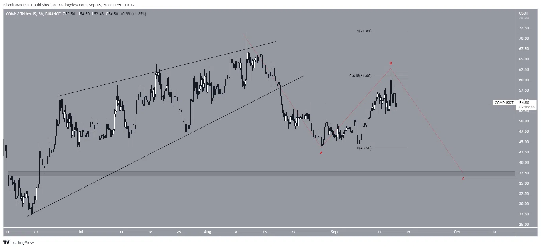 Bien que le cours de Compound ait amorcé un rejet, il a été rejeté par la zone de résistance du retracement de Fibonacci 0,618 situé à 61 $.
